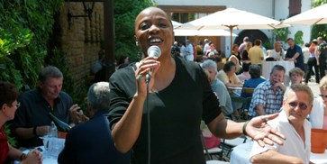 am Sonntag, den 15. Juni, 10 - 15 Uhr, war die bekannte amerikanische Jazz- und Blues-Sängerin Melva Houston mit ihrer Band zu Gast. Melva Houston verstand es meisterlich den Blues mit den Idiomen des Jazz zu verbinden. Sie interpretierte Broadwaysongs mit der gleichen Überzeugungskraft wie Jazzstandards von Gershwin, Ellington, Porter, Monk und Silver. Begleitet wurde sie von einer Band hochkarätiger Musiker. Die sommerlichen Speisen kamen von Volker Krug.